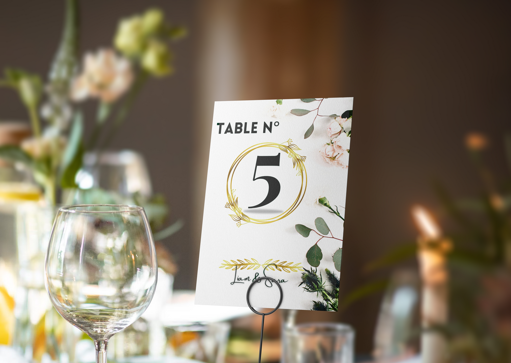 Customizable table numbers on Canva Ideal proportions of 7 inches by 5 inches Creative flexibility to express their own vision Significant savings compared to purchasing ready-made table numbers Assistance and customization services available via email (spehamza@gmail.com) Order our Evergreen Elegance Table Numbers now and save while creating memorable events. Add a touch of glamour to your tables and impress your guests.